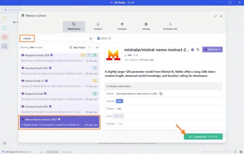 La liste de tous les modèles disponibles s'affiche : il y en a plus de 500 à l'heure actuelle. Si vous recherchez Mistral, vous verrez tous les modèles publiés par Mistral AI. Le modèle NeMo est assez polyvalent et il dispose de 12 milliards de paramètres. Ce n'est pas le plus léger, mais il peut tourner sur un ordinateur personnel bien équipé. Si vous lancez le téléchargement, cela va télécharger un fichier GGUF de 7,48 Go sur votre ordinateur.