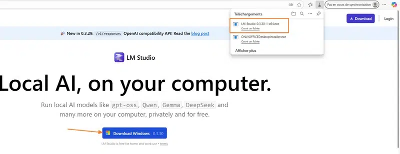 LM Studio est disponible pour Windows, macOS et Linux. On peut le télécharger depuis le site officiel lmstudio.ai. Un exécutable prêt à l'emploi est disponible pour Windows.