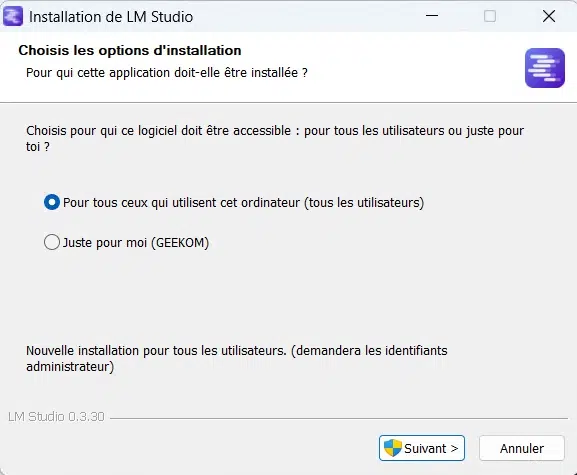 L'installation s'effectue facilement, il n'y a pas de choix particulier à faire lors de celle-ci. Vous pouvez décider de l'installer uniquement pour votre session ou pour toutes les sessions. Ce choix n'a pas d'impact sur la suite.