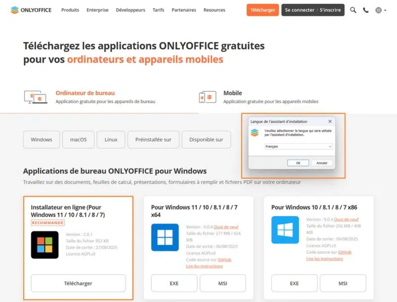 Depuis le site officiel d'ONLYOFFICE, vous devez donc télécharger les applications de bureau pour votre OS.
