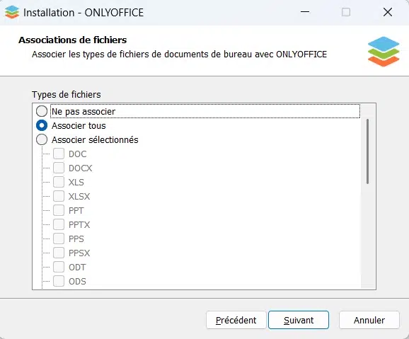 L'installation s'effectue facilement, en quelques clics. Une seule étape est impactante : celle où ONLYOFFICE vous demande de choisir les formats de fichiers pour lesquels vous souhaitez utiliser ONLYOFFICE par défaut. Ce choix vous appartient, mais par défaut, c'est positionné sur "Associer tous".