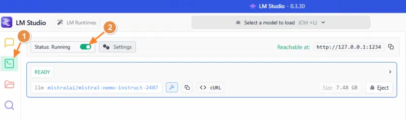 Actuellement, le LLM est chargé dans LM Studio, donc vous pouvez interagir avec lui par l'intermédiaire de la section "Discussion" (premier bouton dans le menu latéral). Néanmoins, pour autoriser les interactions via l'API, et donc via ONLYOFFICE, il faut activer le mode serveur.