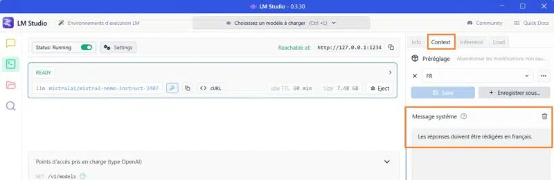Par défaut, LM Studio a tendance à générer des réponses en anglais. En ajoutant une précision du type "Les réponses doivent être rédigées en français." dans les paramètres de contexte, cela influence ses résultats et permet d'obtenir des résultats en français. Sinon, quand vous lui demandez de résumer un texte, il a tendance à fournir un résumé en anglais...
