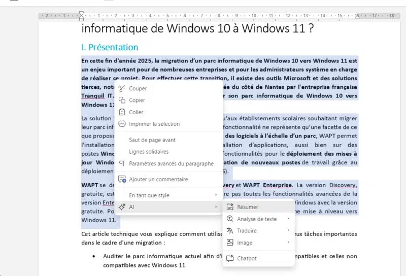 Au-delà du chatbot classique à partir duquel vous pouvez amorcer une conversation, l'IA dans ONLYOFFICE intègre des fonctionnalités pour résumer, reformuler, traduire, etc... Elles sont visibles dans le menu contextuel. Par exemple :