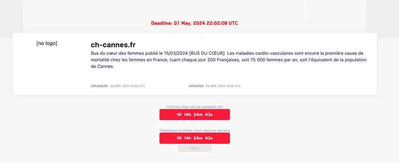 En effet, ceci semble être de l'histoire ancienne, car ce 30 avril 2024, le groupe de LockBit a revendiqué la cyberattaque contre l'Hôpital Simone Veil de Cannes. L'établissement a été référencé sur le site de LockBit :
