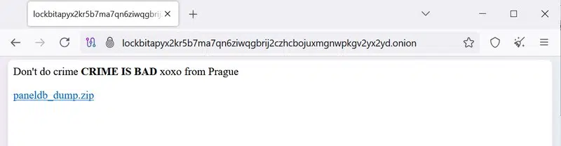 En effet, l'interface d'administration utilisée par les affiliés de LockBit affichent désormais le message suivant : "Don't do crime CRIME IS BAD xoxo from Prague", que l'on peut traduire en "Ne commets pas de crimes, LES CRIMES C'EST MAL, bisous de Prague." Cette phrase est accompagnée d’un lien vers une archive ZIP intitulée paneldb_dump.zip. Ce fichier contient une base de données extraite du panneau des affiliés de LockBit, révélant les coulisses de ce gang... Ces données seraient datées du 29 avril 2025.
