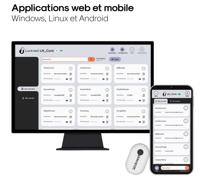 - Lorsque le boitier est déverrouillé, l'utilisateur peut accéder au tableau de bord de son Locknest, sur l’application mobile ou l’application web, enregistrer des données et générer des mots de passe robustes.