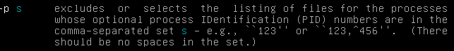 Pour avoir des informations sur comment nous pouvons spécifier un processus ou un utilisateur à la commande LSOF, nous allons aller voir son manuel d'utilisation :