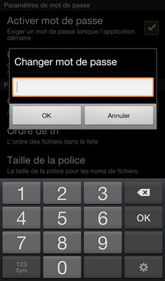 Après avoir installé l'application, je vous invite à l'ouvrir sur votre appareil. Au premier lancement, un message vous indique que vous n'avez pas encore définit de mot de passe. Nous allons commencer par là, cliquez sur "Paramètres" et cochez la case "Activer mot de passe" et ensuite "Changer mot de passe" qui doit contenir exclusivement des nombres. Pas très sécurisé mais on fera avec, misez sur la longueur.
