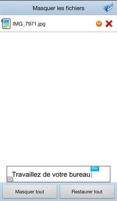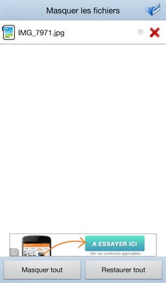 Elle est disponible gratuitement, est en français et occupera seulement 6.5 Mo sur votre appareil. Pour dissimuler les fichiers, ils sont supprimés "fictivement" afin que vous puissiez les retrouver facilement. Vous le verrez par vous-même, cette application est simple mais présent deux légers inconvénients : Une publicité est présente mais au moins l'application est gratuite, et, on ne peut pas avoir un aperçu des fichiers que l'on souhaite masquer, il est obligatoire de se fier au nom des fichiers.
