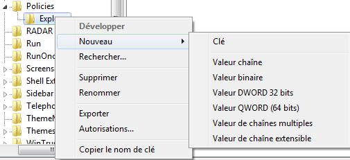 Ensuite, faites clic droit sur "Policies" puis "Nouveau" et "Clé". Nommez-la "Explorer".