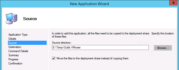 Le chemin du dossier de l'application fictive doit ensuite s'afficher au niveau champ "Source Directory". Cochez éventuellement la case "Move the files to the deployment share instead of copying them" puis cliquez 2 fois sur "Next".
