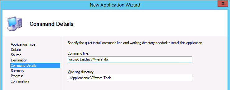 Dans le champ "Command line" entrez la commande d'installation correspondante, comme par exemple "wscript DisplayVMware.vbs"