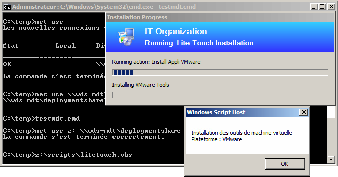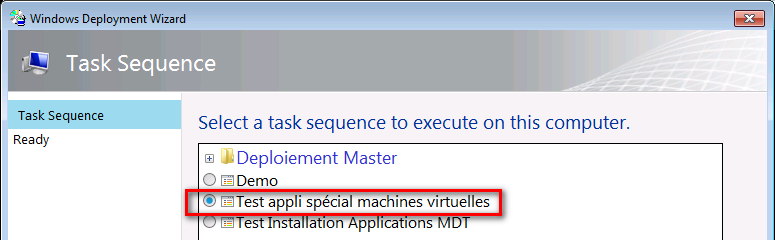 Si vous avez créé une séquence dédiée (cf remarque facultative), rendez-vous sur l'une de vos machines virtuelles, puis exécutez le script "LiteTouch.vbs" de votre MDT, et choisissez cette séquence de test.