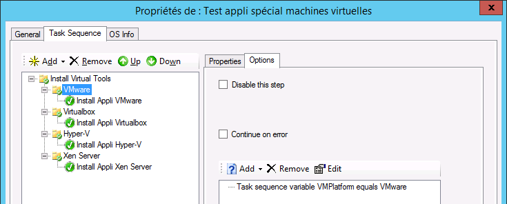 Cliquez sur "Add … Task Sequence Variable" puis indiquez la variable "VMPlatform", sélectionnez l'opérateur de condition "equals" et enfin la valeur correspondante au sous-groupe concerné, soit "Hyper-V", "VMware", "Xen" ou "VirtualBox".