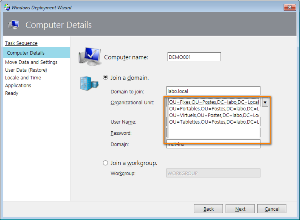 Je souhaite lors du déploiement d’un poste pouvoir afficher la liste des OU ou seront intégrés les postes dans le domaine. j’ai vu que c’est possible sur MDT 2012.