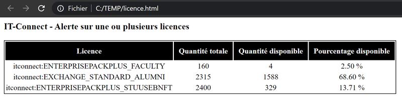 $HTMLTab = "<h3>$O365TenantName - Alerte sur une ou plusieurs licences</h3>