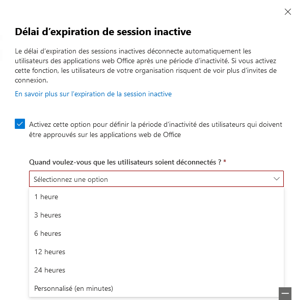 Pour configurer cette fonctionnalité, vous pouvez vous référer à la documentation suivante : Microsoft Docs. En résumé, elle se situe à l'emplacement suivant du centre d'administration : Paramètres de l'organisation > Sécurité et confidentialité > Délai d'expiration de session inactive. Une fois ce paramètre configuré, il ne faut que quelques minutes pour que la nouvelle configuration soit effective.