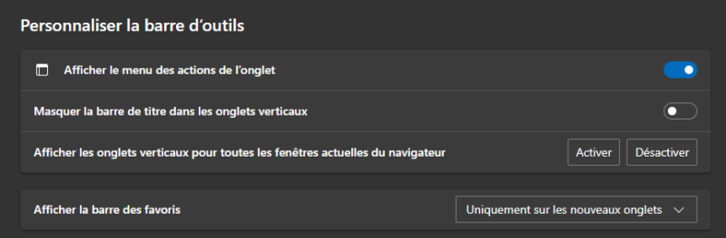 Microsoft a intégré une nouvelle fonction pour ranger ses onglets à la verticale, mais aussi pour masquer la barre de titres, ce qui permet de gagner en hauteur. Sur les grands écrans, cela peut s'avérer intéressant pour optimiser l'espace au sein de la fenêtre du navigateur. Ces options sont disponibles dans : Paramètres > Apparence > Personnaliser la barre d'outils.