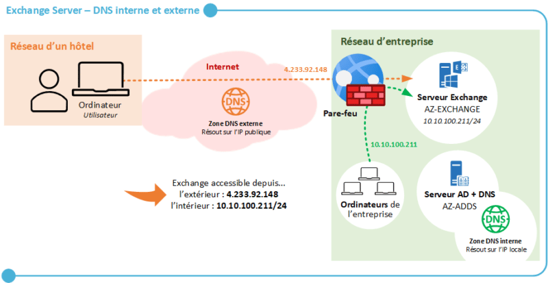 Un serveur de messagerie Exchange, au même titre qu'un Active Directory, s'appuie sur le DNS pour son fonctionnement. Ce serveur Exchange hébergé sur votre infrastructure (dans une DMZ) est accessible à la fois depuis l'extérieur et depuis l'intérieur de votre réseau local.