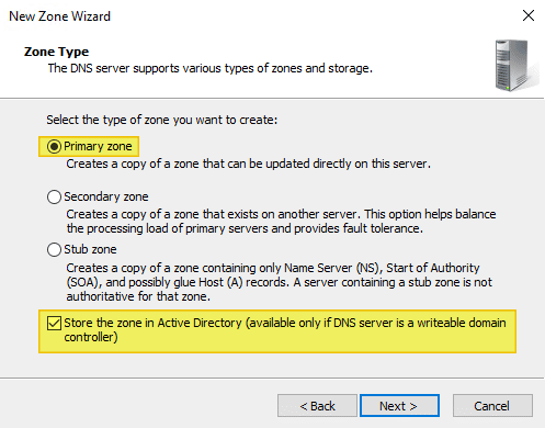 Nous allons créer une zone primaire "Primary zone" et elle sera stockée dans l'Active Directory ("Store the zone in Active Directory").