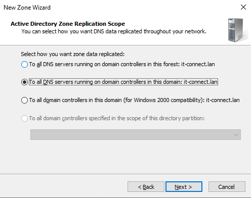 A l'étape suivante, on décide de répliquer cette zone auprès de tous les contrôleurs de domaine du domaine "it-connect.lan" pour unifier la résolution de noms pour cette zone.