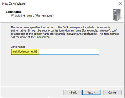 En ce qui concerne le nom de la zone, nous allons indiquer "mail.florianburnel.fr" pour définir un enregistrement local personnalisé uniquement pour ce sous-domaine.