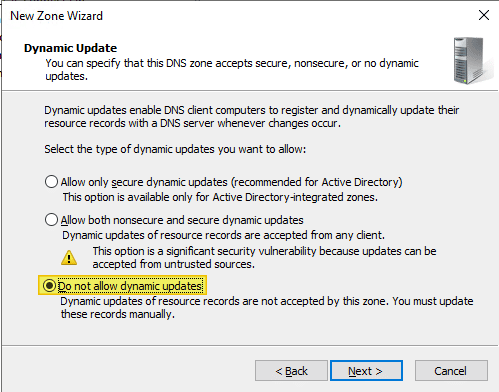 On poursuit en choisissant de refuser les mises à jour dynamiques ("Do not allow dynamic updates"). Puis, on finalise l'ajout de la zone.