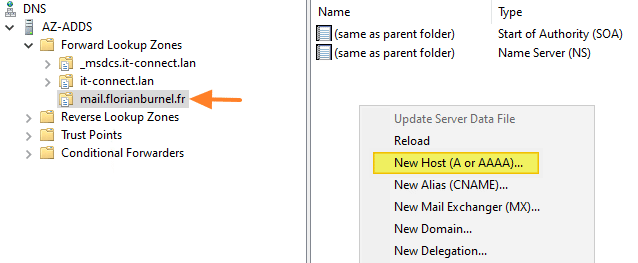 D'un point de vue du DNS interne, nous allons appliquer le principe du PinPoint DNS, c'est-à-dire que l'on va créer une zone "mail.domaine.fr" et une zone "autodiscover.domaine.fr" qui vont contenir un enregistrement de type A qui pointe vers l'adresse IP locale du serveur Exchange Server 2019. C'est préférable d'utiliser cette méthode plutôt que de créer la zone "domaine.fr" sinon cela oblige à maintenir la zone deux fois : en local et sur l'interface du fournisseur DNS.