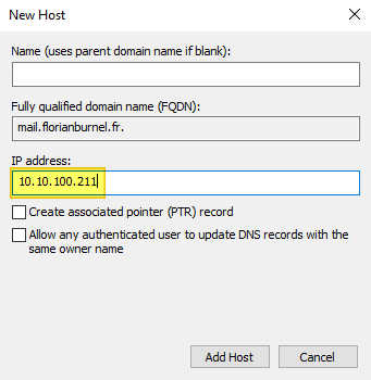 Nous n'indiquons pas de nom, car on souhaite jouer sur la résolution "mail.florianburnel.fr", et non d'un autre hôte. Pour l'adresse IP, il faut indiquer l'adresse IP privée du serveur Exchange, à savoir "10.10.100.211" dans mon cas. Ainsi, la résolution s'effectuera sur l'adresse IP interne pour cette adresse.