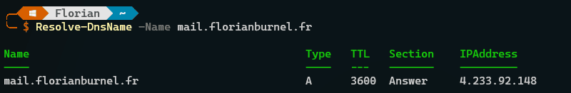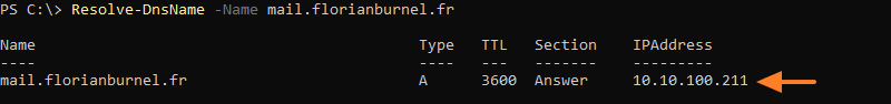 À partir d'une machine cliente, il est possible de vérifier la résolution de noms. On peut utiliser Resolve-DnsName en PowerShell, ou l'outil nslookup, voire même l'outil en ligne MXToolbox (qui a aussi une option pour valider votre SPF). On peut remarquer que c'est opérationnel et que l'adresse IP publique est associée à "mail.florianburnel.fr".