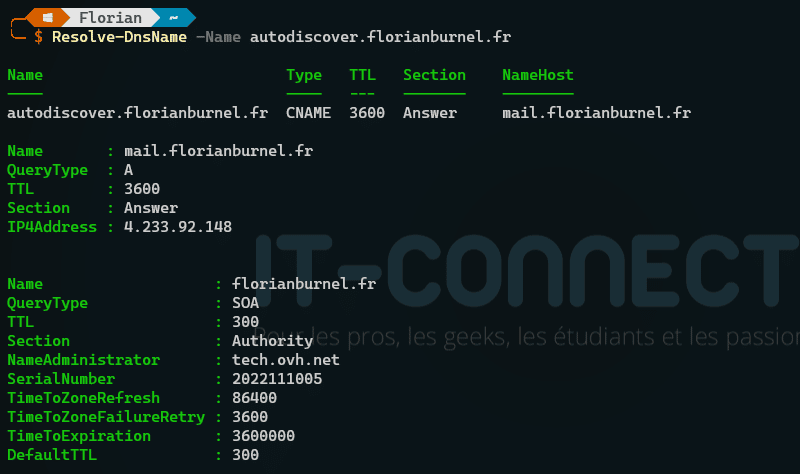 La résolution de noms fonctionne aussi pour l'enregistrement associé à l'Autodiscover.