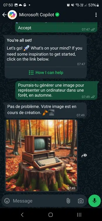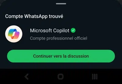 Cette intégration permet aux utilisateurs de WhatsApp de converser avec le chatbot IA sans pour autant installer l'application Copilot. La conversation avec Copilot apparaît aux côtés de vos autres conversations WhatsApp. Vous n'aurez qu'à parler en langage naturel pour solliciter l'IA.