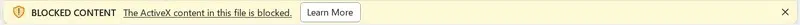 Lorsque ce changement sera déployé, les utilisateurs verront une notification lorsque le document contient un contrôle ActiveX. Cette notification précisera : "CONTENU BLOQUE : le contenu ActiveX dans ce fichier est bloqué." ("BLOCKED CONTENT: The ActiveX content in this file is blocked."), comme le montre l'image ci-dessous. Ainsi, les objets ActiveX ne seront plus exécutés, que ce soit un objet légitime ou malveillant. Le bouton "En savoir plus" ("Learn More") quant à lui renvoie sur cette page.