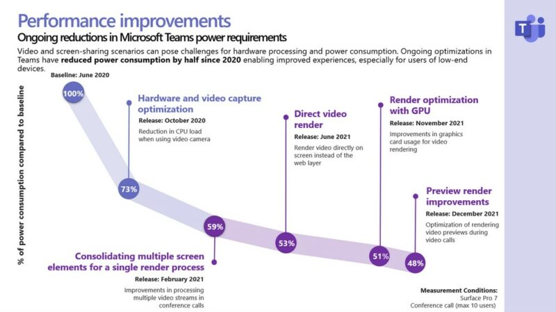 Pour que Teams soit moins énergivore, Microsoft a optimisé les processus liés à la capture, l'encodage et le rendu du contenu. Ces actions liées au traitement des flux vidéos sollicitent le matériel, ce qui forcément augmente la consommation d'énergie. Cela est d'autant plus vrai lorsqu'il y a plusieurs participants, car Teams doit traiter les flux de streaming en provenance des différents participants.