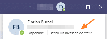 Au sein du client Teams, cliquez sur votre avatar en haut à droite pour afficher le menu. Cliquez ensuite sur le lien "Définir un message de statut".