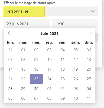 Il ne reste plus qu'à déterminer pendant combien de temps le message doit être configuré. Pour cela, il faut configurer le champ "Effacer le message de statut après..." et là vous choisissez la date et l'heure qui vous convient. Ce qui devrait correspondre à votre date de retour de congés. 🙁
