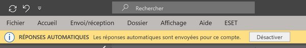 Lorsque vous êtes en plein dans votre période d'absence, le message "Réponses automatiques" s'affichera dans Outlook. Si vous cliquez dessus, une fenêtre de configuration va s'afficher dans Outlook : les paramètres seront les mêmes que ceux définis dans Teams.