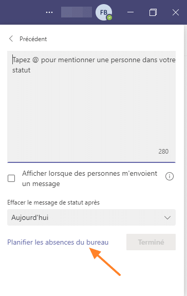 Validez la création de votre statut en cliquant sur le bouton "Terminé". Ce message est visible dans votre statut Teams (pour les autres utilisateurs) et il s'affiche au sein du menu Teams :