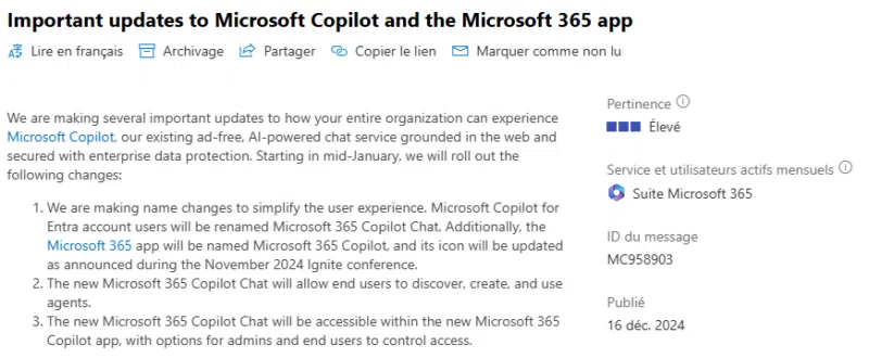 Ce changement a été annoncé le 16 décembre 2024 dans la note d'évolution MC958903 publiée par Microsoft dans le Centre de messages du Centre d'administration Microsoft 365. Il a également été évoqué par les équipes de Microsoft lors de la conférence Ignite qui s'est déroulée en novembre 2024. Il s'accompagne d'un changement d'icône. Voici un aperçu de ce message :