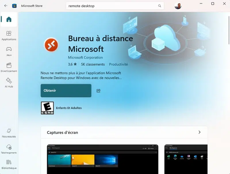 Commençons par une précision importante : Microsoft parle de l'application Bureau à distance (Remote Desktop) disponible sur le Microsoft Store. Il n'est pas question ici de remplacer le client Connexion Bureau à distance intégré à Windows (mstsc.exe). L'application Bureau à distance développée par Microsoft se présente comme un gestionnaire de connexion RDP, prenant la forme d'une application moderne.