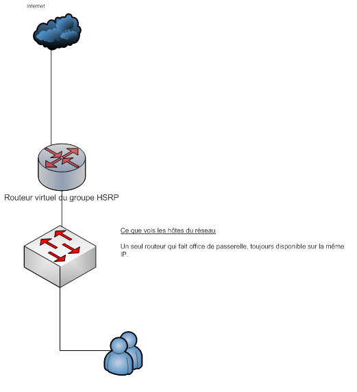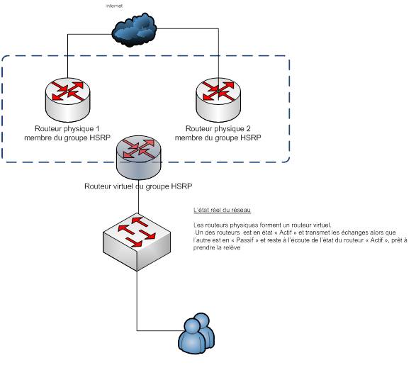 Les routeurs physiques forment un routeur virtuel. Un des routeurs est en état « Actif » et transmet les échanges alors que l’autre est en « Passif » et reste à l’écoute de l’état du routeur « Actif », prêt à prendre la relève. En réalité, le routeur que voient les utilisateurs est un routeur virtuel composé de plusieurs routeurs qui travaillent via le protocole HSRP. Formant un groupe, un routeur sera désigné comme le routeur actif qui travaillera réellement et le ou les autres se tiendront prêt à prendre la relève si besoin.
