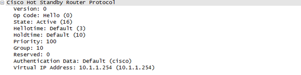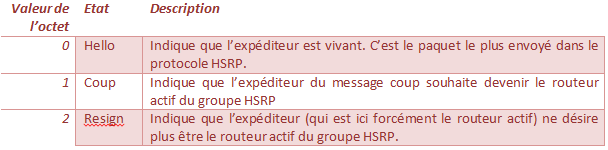 On peut, à partir de cette analyse de trames, voir la composition d’une entête d’un paquet HSRP et alors mieux comprendre le fonctionnement de ce protocole. Ces entêtes sont codées sur 20 octets :