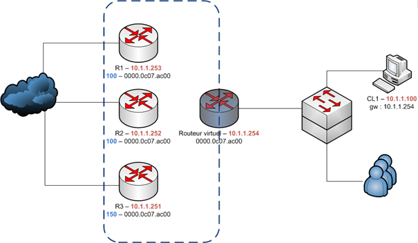 Nous voyons donc nos trois routeurs physiques qui forment un groupe représenté par le routeur virtuel disponible à l’IP 10.1.1.254. En bleu nous voyons également les priorités que nous mettrons sur nos routeurs. Nous laisserons donc les routeurs « R1 » et « R2 » en priorité par défaut 100 et mettrons « R3 » en priorité 150. Ce sera donc « R3 » qui sera, lors de l’élection, élu comme prioritaire et actif. En revanche si le routeur « R3 » vient à tomber, c’est « R1 » qui prendra le relais car, à priorité égale, c’est le routeur avec l’IP la plus haute qui prend le relais. Ici c’est donc « R1 » avec l’IP « 10.1.1.253 ».