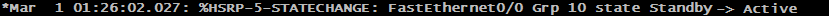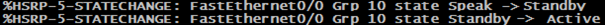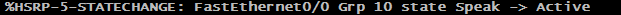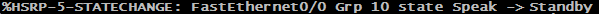 « Standby » est la commande qui permet la configuration du HSRP. « 10 » est le numéro du groupe HSRP dont fait partie l’interface. Il faut savoir qu’un routeur peut faire partie de plusieurs groupes HSRP. Nous aurons alors cette annonce qui se fera sur notre terminal :