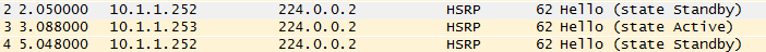 On voit bien que les routeurs actifs et passifs envoient en multicast sur l’adresse 224.0.02 leur état dans des paquets « Hello » à intervalle régulier.