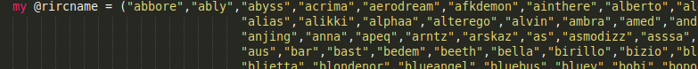 Il s'agit donc vraisemblablement d'un script qui permet la constitution d'un botnet dirigé par un canal IRC en vue de déclencher des attaques par déni de service. En toute logique, le script génère une connexion vers un canal IRC qui est ensuite utilisé pour suivre des ordres donnés par le propriétaire du botnet. On peut voir que lors de sa connexion, le script s'assigne aléatoirement un pseudo :