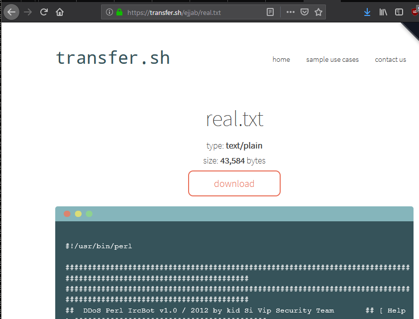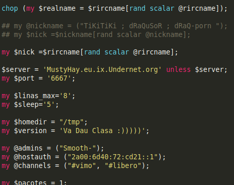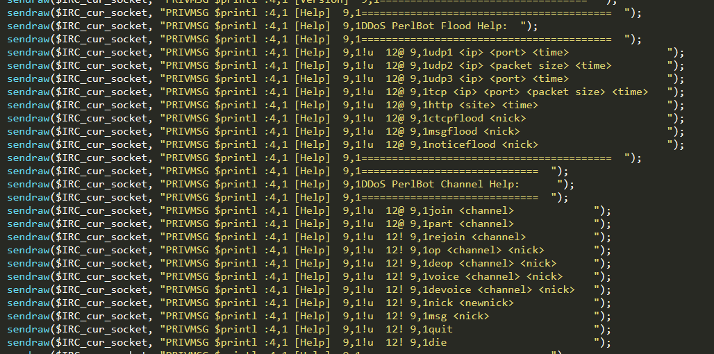 Son titre est "DDoS Perl IrcBot", il s'agit visiblement d'un script trouvé sur internet. On peut trouver un code équivalent ici par exemple : dépôt Github
