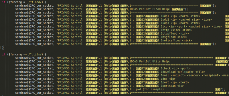 L'analyse du code source permet également d'en savoir plus sur les actions possibles du botnet :