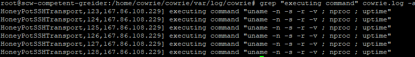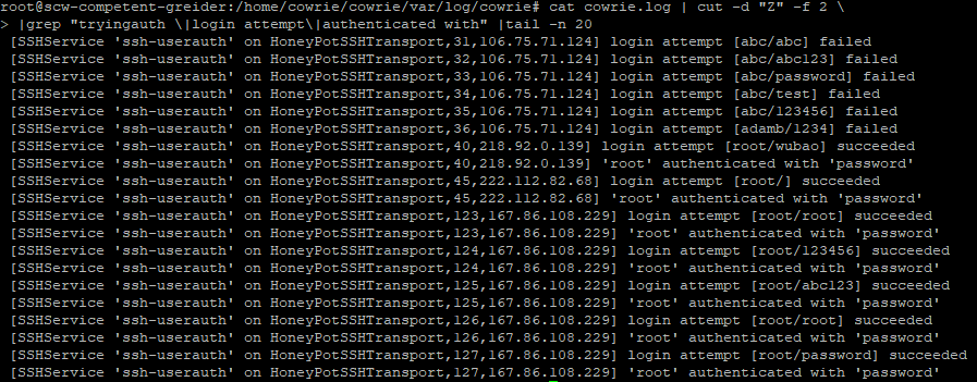 root@scw-competent-greider:/home/cowrie/cowrie/var/log/cowrie# cat cowrie.log |grep "login attempt" |wc -l 14201 root@scw-competent-greider:/home/cowrie/cowrie/var/log/cowrie# cat cowrie.log |grep "succeed" |wc -l 13405